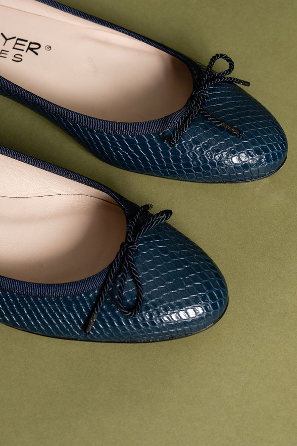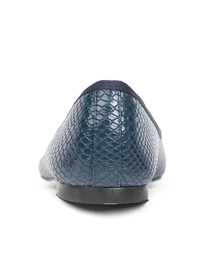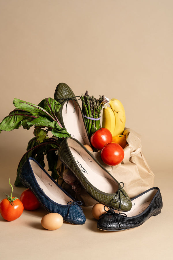 Our Luxe Textured Ballet Flat offers a polished twist on a classic silhouette. The delicate printed leather design creates a soft, snake-inspired texture that feels effortlessly chic and incredibly luxe. Handmade in Spain with our signature adjustable bow, this flat is offered in Olive, Navy, and Black—three rich colors to carry you through the season in style.