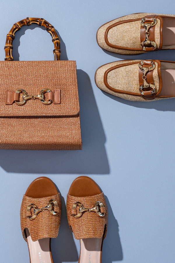 - Raffia upper with gold tone horsebit