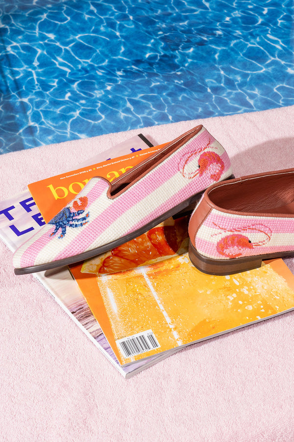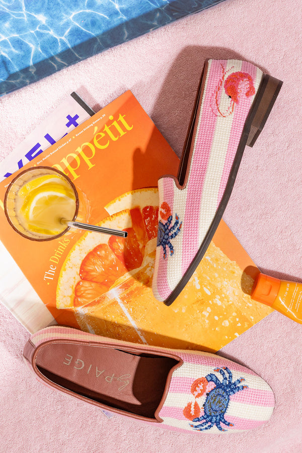 Add a playful touch to your footwear collection with the ByPaige Needlepoint Loafer in Crab on Pink & Ivory Stripe. Designed in the USA by Paige Andrews, this whimsical loafer features a charming needlepoint stitched crab design set against a vibrant pink and ivory striped backdrop, making it perfect for those who love a pop of personality in their style.