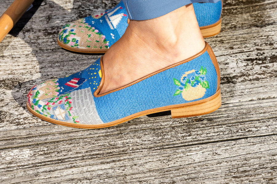 Meet the Needlepoint Loafer in Nantucket, a picturesque coastal scene brought to life in vibrant, stitched detail. This enchanting design celebrates everything we love about the island—from its beloved lighthouse and colorful sailboats to blooming hydrangeas, a floral-covered cottage, and a charming picket fence complete with a bicycle. Thoughtful artwork continues along the sides with a basket of hydrangeas, making every angle delightfully unique.