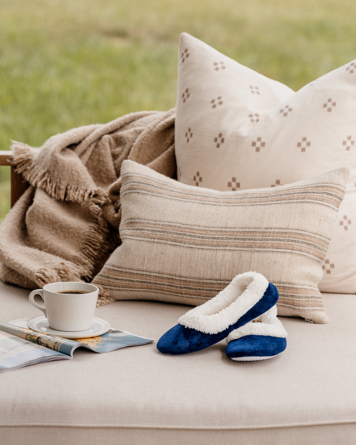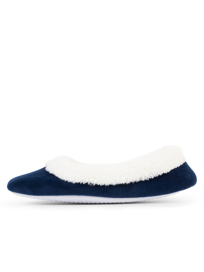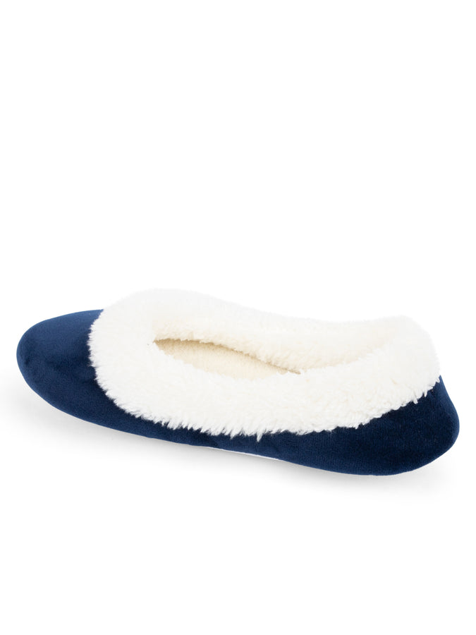 Plush perfection, now in navy. These dainty slippers pamper your feet with a plush fleece lining and soft, yet supportive, cushioned footbed. The sherpa-look fleece is extra cozy and keeps even the frostiest feet toasty and cozy. Cozy up to fall in our newest shade of Angelina sherpa slippers. Skid-resistant rubber outsole adds traction.