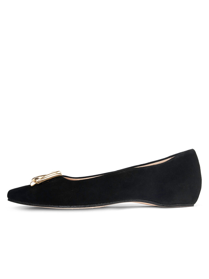 The Bella Flat is a luxury black suede flat, handcrafted in Spain with exceptional attention to detail. Featuring a bold sculptural gold square buckle and a hidden wedge for added comfort, these designer flats are perfect for work, travel, and everyday wear. A chic pointed-toe silhouette makes them the ultimate black flats with gold buckle for versatile, elevated style.