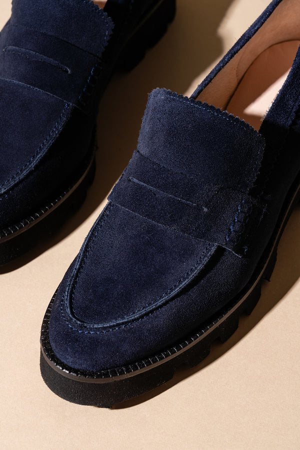 Patricia Green Women’s Vince Lug Sole Penny Loafer in Navy Suede