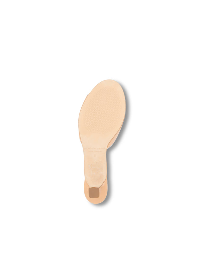 A feminine and dainty kitten heel slide with a peep-toe and contrast leather piping with a delicate bow. This sandal is elegant and divine, a neutral must-have that pairs with everything from dresses to denim and comfortable day to night.