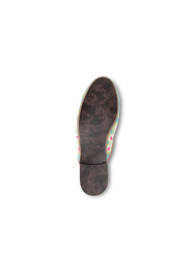 A handstitched needlepoint mule with whimsical designs to fit your every mood. Leather trim and lining.