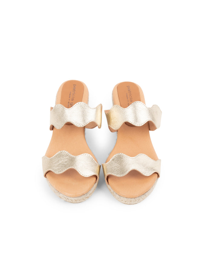 Timeless and stylish espadrille wedge sandals detailed with scalloped leather straps on a jute platform. Designed by Patricia Green herself, with a mission to design and develop footwear collections for the contemporary woman. Patricia’s collection embraces refined feminine style, with a touch of whimsy – and are always comfortable to wear!