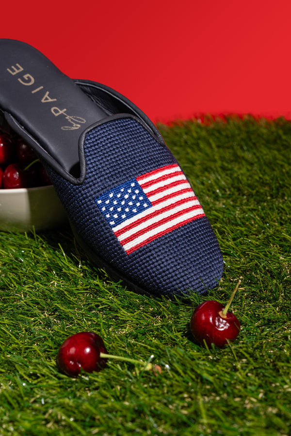 Our most sought after summer needlepoint, an iconic navy backdrop with the American flag stitched in the center of our slip-on mule. Summer in a shoe!
