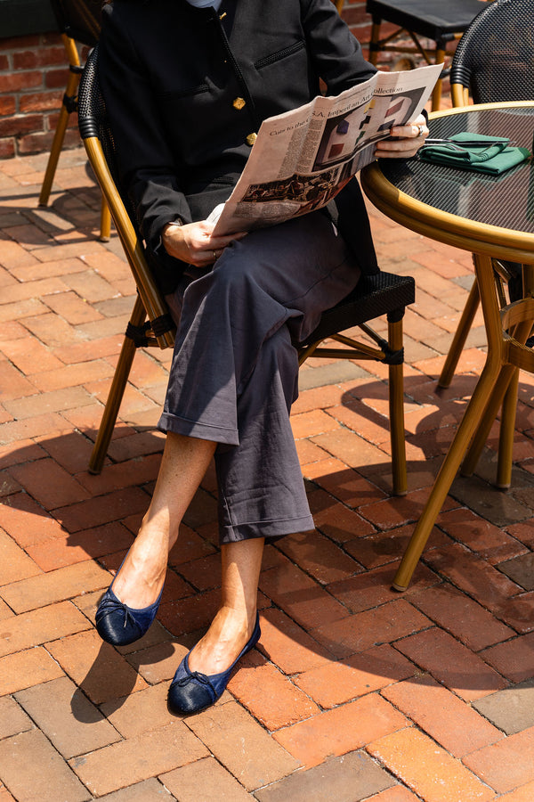 Elevate your everyday with our iconic ballet flat, now in supple haircalf for a refined finish. Handmade in Spain with a durable leather sole and our signature adjustable bow for the perfect fit. Choose from deep navy or warm brown with a contrasting black cap toe.