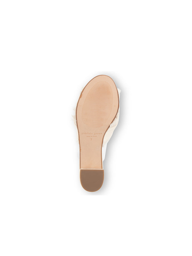 Crossover fringe edged straps of a Spanish slide sandal lifted by a just-right block heel. These are timeless and versatile slide sandal heels that are casual yet sophisticated.