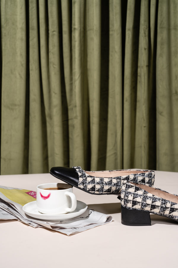 A tweed block heeled pump with a smooth leather cap toe. We're obsessed with this rich, versatile tweed that will go with everything in your fall/winter wardrobe.