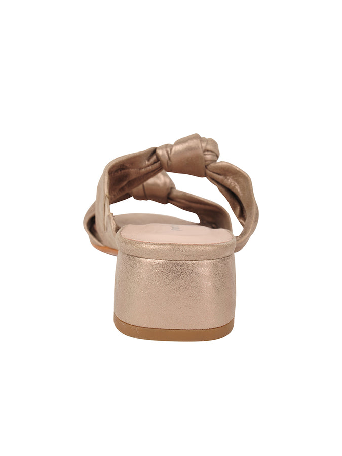 A low heeled block sandal with knotted leather detailing along the straps.
