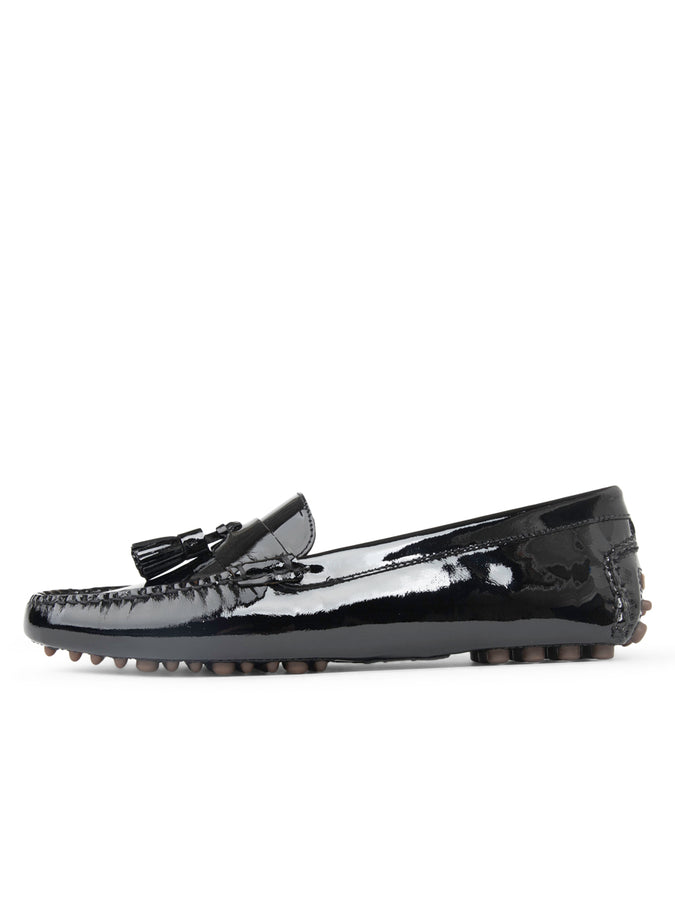 A sleek patent leather driving moccasin with traditional rubber nub sole for ultimate traction and shock absorption for supreme comfort. We love the patent leather, especially on a rainy day thanks to its water repelling nature.