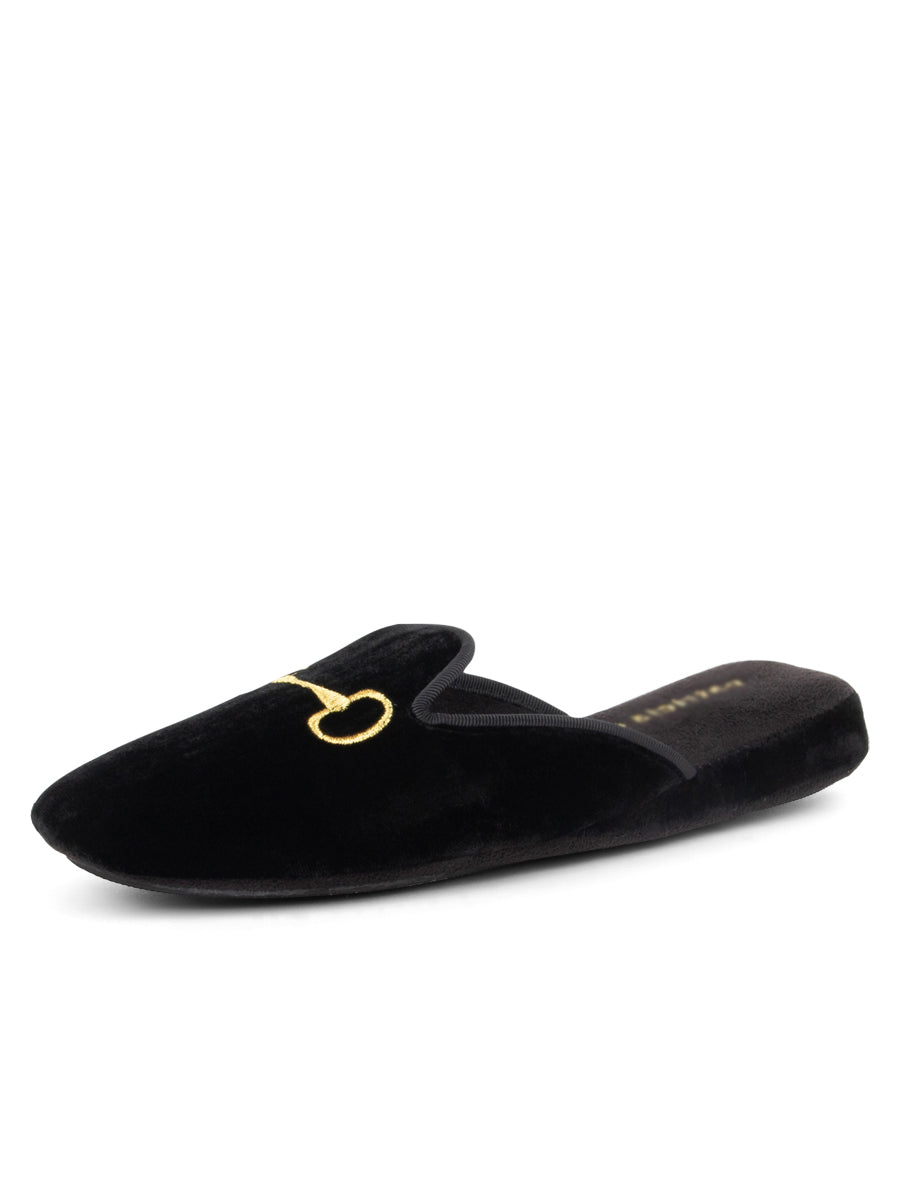 An elegant, rich velvet slipper features golden horse bit embroidery to liven up your lounge look with a touch of elegance.