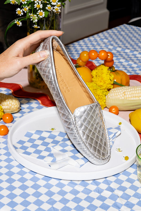 Elevate your style with the Jillian Metallic Quilted Driver, the perfect blend of sparkle, sophistication, and comfort.