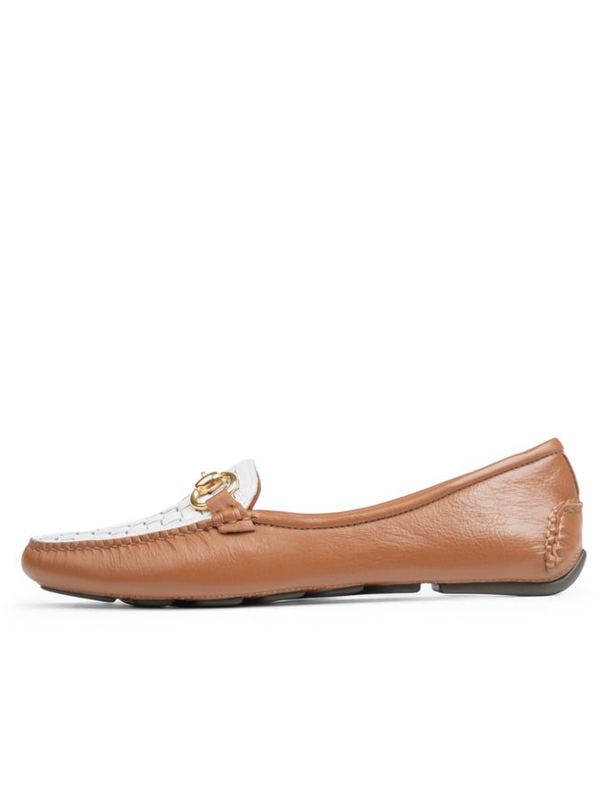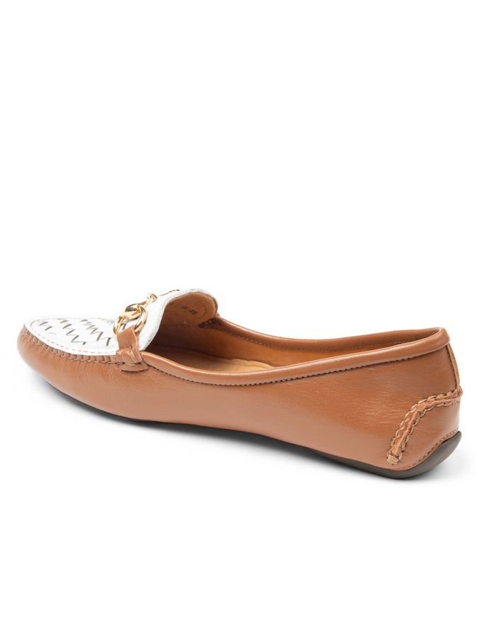 Elevate your footwear collection with the Kim Horsebit Woven Driver from Patricia Green. Hand-stitched in Brazil, this luxurious moccasin showcases an elegant blend of craftsmanship and style. The woven leather detailing on the vamp, combined with the polished gold-tone horsebit, creates a refined, textured look that is both modern and timeless. The two-toned design is a fresh update to our beloved driving shoe. Step into elegance and effortless style with the Kim Horsebit Woven Driver, where luxury meets practicality.
