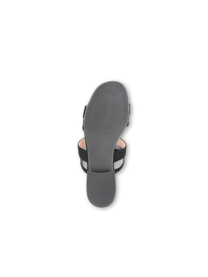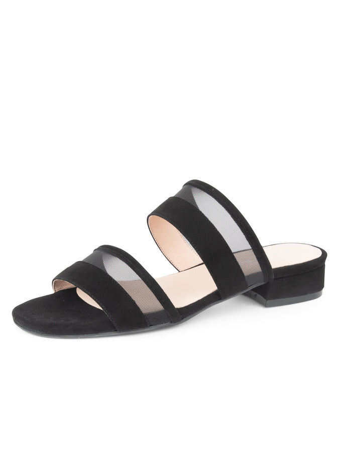 Two strap suede sandal with mesh detail. The perfect sandal to slip into from day to night.