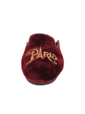 An ultraplush slipper fashioned from rich velvet with tonal grosgrain trim. Embroidered in gold with "Paris" accented by the Eiffel Tower. This slipper is the definition of chic!