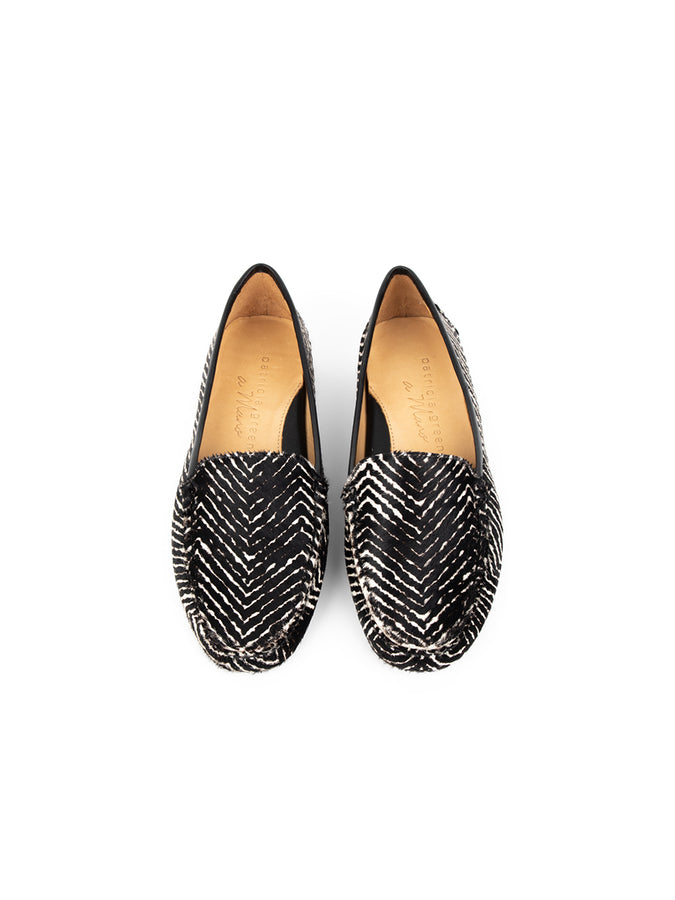 Patricia Green Women’s Jillian Driving Moccasin in Haircalf in Black & White Herringbone Haircalf