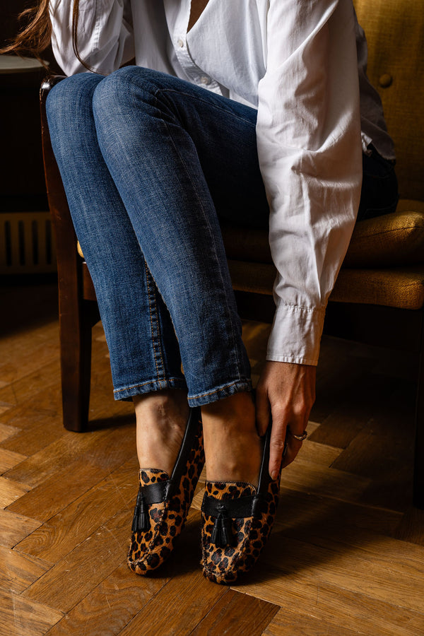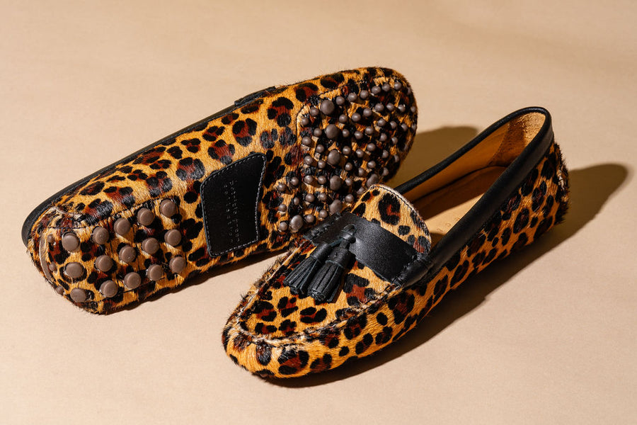 Classic with a twist, our Jordan Tassel Driver steps into fall in sleek black leather and bold leopard haircalf. Handcrafted in Brazil, these luxe loafers feature playful tassel detailing and our signature flexible driver sole for all-day comfort. Effortlessly chic from desk to dinner.