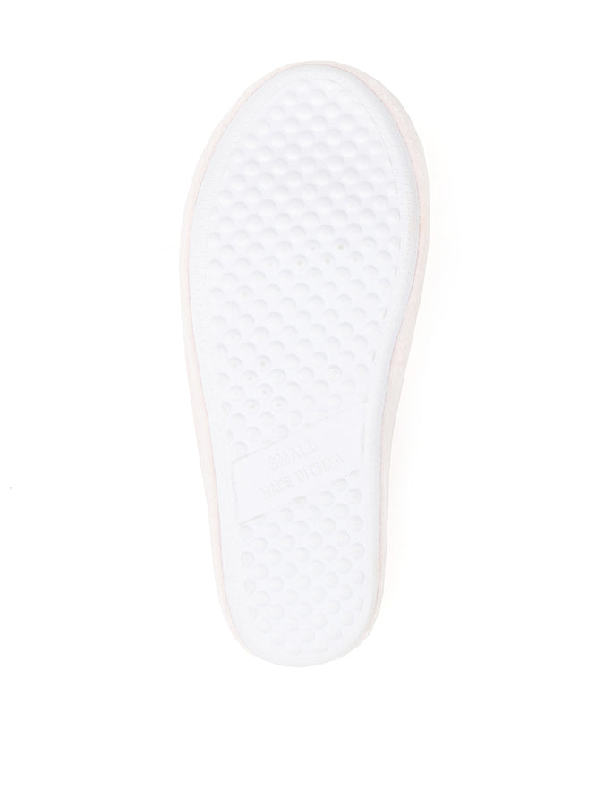 A low wedge slipper styled with a classic loafer-mule profile and shimmering at the toes with a gleaming reminder to relax.