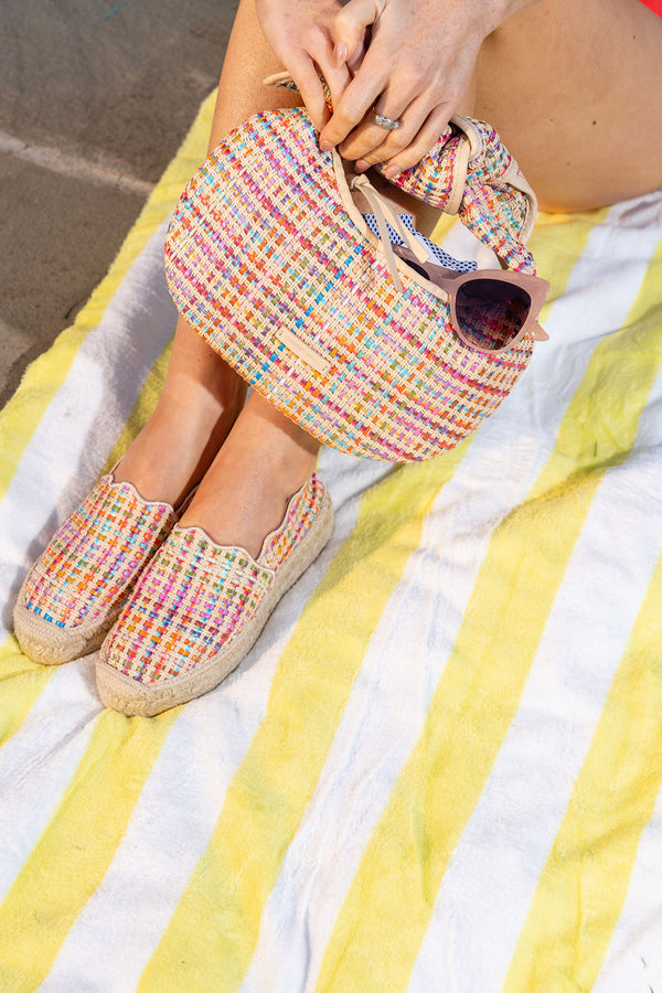 Say hello to the newest evolution of our cult-favorite Rio Raffia Knot Bag. After the lime raffia version sold out in a flash, we’re introducing two brand-new shades that elevate the playful silhouette you already love: Gold/Natural and our signature Rainbow Raffia.