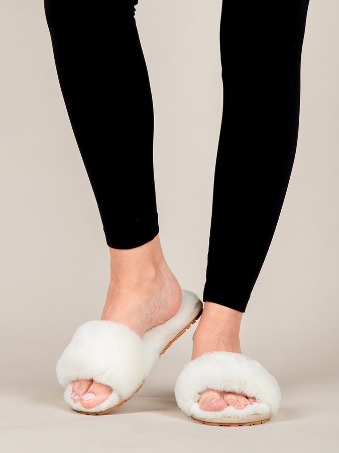 Feel like you are walking in the clouds with the luxe shearling single strap slippers. A sturdy rubber sole makes these easy to wear day to night.